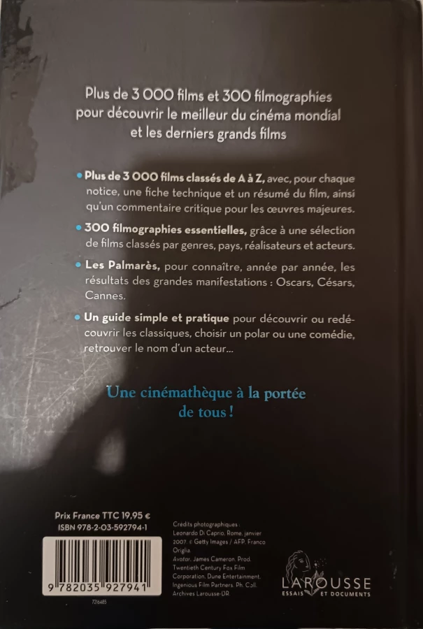 Plus de 3 000 films et 300 filmographies pour découvrir le meilleur du cinéma mondial et les derniers grands films : Plus de 3 000 films classés de A à Z, avec, pour chaque notice, une fiche technique et un résumé du film, ainsi qu’un commentaire critique pour les oeuvres majeures. 300 filmographies essentielles, grâce à une sélection de films classés par genres, pays, réalisateurs et acteurs. Les Palmarès, pour connaître, année par année, les résultats des grandes manifestations : Oscars, Césars, Cannes. Un guide simple et pratique pour découvrir ou redécouvrir les classiques, choisir un polar ou une comédie, retrouver le nom d’un acteur…