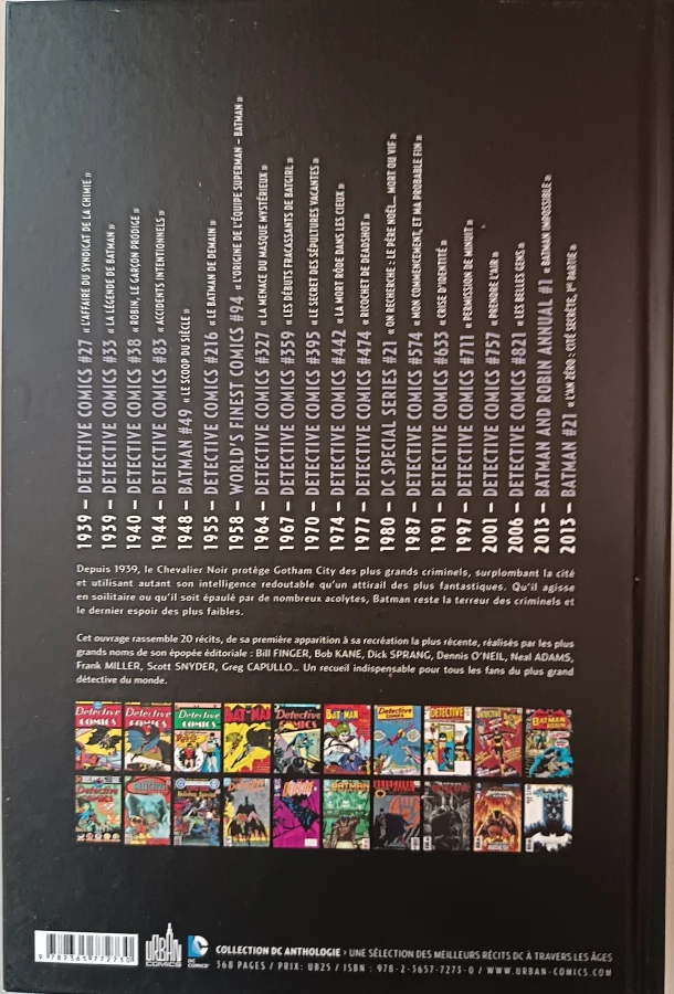 La légende du plus célèbre des héros de comics en vingt récits réalisés par ses plus grands auteurs. Bill FINGER, Bob KANE, Frank MILLER, Dennis O'NEIL, Paul DINI, Neal ADAMS, et bien d'autres se retrouvent au sommaire de cette anthologie inédite. En conclusion de cet ouvrage, la première partie inédite de « Batman Année Zéro » par Scott SNYDER et Greg CAPULLO !