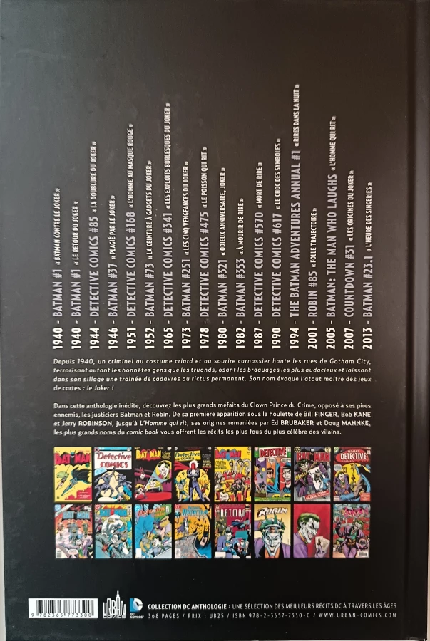 Il est le pire ennemi du plus grand détective du monde, le plus célèbre de tous les malfaisants, le Clown prince du Crime… le Joker ! Dans cette anthologie inédite, retrouvez les plus grands méfaits de ce scélérat au sourire démoniaque qui hante les nuits de Gotham City depuis près de 75 ans ! Une sélection d’épisodes servie par les plus grands noms du comic book.