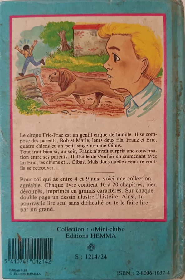 Le cirque Fric-Frac est un gentil cirque de famille. Il se compose des parents, Bob et Marie, leurs deux fils, Franz et Eric, quatre chiens et un petit singe nommé Gibus. Tout irait bien si, un soir, Franz n’avait surpris une conversation entre ses parents. Il décide de s’enfuir en emmenant avec lui Eric, les chiens et… Gibus. Mais dans quelle aventure vont-ils se retrouver… Pour toi qui as entre 4 et 9 ans, voici une collection agréable. Chaque livre contient de 16 à 20 chapitres, bien découpés, imprimés en grands caractères. Sur chaque double page, un dessin illustre l’histoire. Ainsi, tu pourras le lire seul sans difficulté ou te le faire lire par un grand.