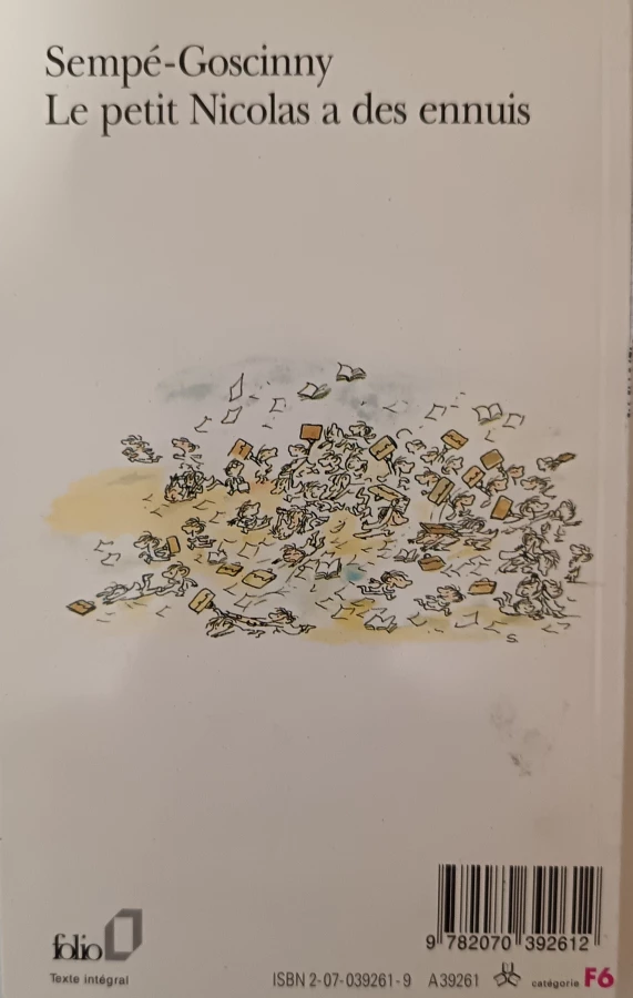 « Nicolas est de retour pour nous raconter de nouveaux épisodes de sa vie agitée de petit garçon actif. Il est entouré non seulement de Joachim, un copain, mais de tous les autres : Alceste, le gros qui mange tout le temps des choses, Eudes, qui aime bien donner des coups de poing sur le nez des copains, Rufus, qui a un papa agent de police qui lui cède ses vieux sifflets à roulette, Maixent, qui a des jambes très longues avec de gros genoux sales, Clotaire, qui est le dernier de la classe, mais qui a un vélo et Agnan, le chouchou. Ils sont tous là, amis fidèles et éprouvés, avec lesquels on peut se battre sans arrière-pensée, tout en se jurant presque quotidiennement de ne plus se parler de toute la vie. »