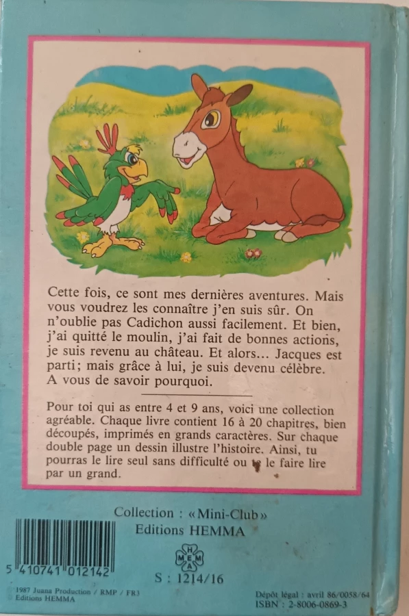 Cette fois, ce sont mes dernières aventures. Mais vous voudrez les connaître j'en suis suis sûr. On n'oublie pas Cadichon aussi facilement. Et bien, j'ai quitté le moulin, j'ai fait de bonnes actions, je suis revenu au château. Et alors... Jacques est parti ; mais grâce à lui, je suis devenu célèbre. A vous de savoir pourquoi.