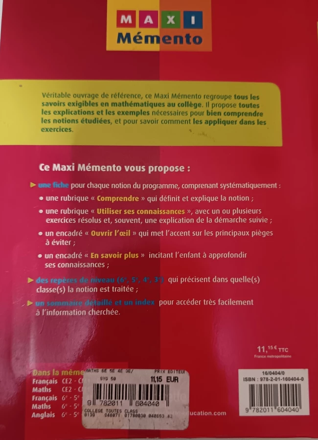 Dans ce Maxi Mémento :Une fiche pour chaque notion du programme, comprenant systématiquement :- Un exemple illustrant la notion étudiée.- Une rubrique « Comprendre » qui définit et explique la notion.- Une rubrique « Utiliser ses connaissances », avec un ou plusieurs exercices résolus et, souvent, une explication de la démarche suivie.- Un encadré « Ouvrir l’œil » qui met l’accent sur les principaux pièges à éviter.- Un encadré « En savoir plus » incitant l’enfant à approfondir ses connaissances.Des repères de niveaux qui précisent dans quelle(s) classe(s) la notion est abordée.Un sommaire détaillé et un index pour accéder très facilement à l’information cherchée.
