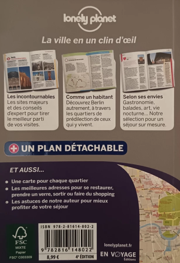Toutes les clés pour découvrir Berlin le temps d'un week-end Un guide tout en couleurs, concis et ultra pratique pour découvrir Berlin en quelques jours. Tous les principaux sites décryptés : le Reichstag, la porte de Brandebourg, la Pinacothèque, le Musée juif, l'East Side Gallery, la Postdamer Platz... Un découpage de la ville en quartiers avec, pour chacun, un focus sur les sites incontournables, une suggestion d'itinéraire et les meilleures adresses pour se restaurer, prendre un verre, sortir, visiter ou faire du shopping. Plusieurs suggestions de parcours et d'itinéraires thématiques : se balader dans le Mauerpark le dimanche, découvrir le quartier tranquille de Schöneberg, faire la tournée des bars à Kreuzberg... Des focus sur les restaurants, bars, discothèques, spectacles et la scène gay et lesbienne à Berlin, pour profiter de la bouillonnante vie nocturne de la métropole. Des éclairages sur l'histoire et la culture de la capitale allemande (Berlin sous le svastika, La vie en RDA, la techno berlinoise ...). De nombreuses cartes et un plan détachable avec les principaux sites, un index des rues et un plan du métro pour faciliter les déplacements.